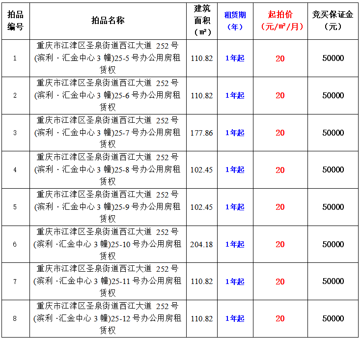 1、重庆市江津区圣泉街道西江大道 252号(滨利·汇金中心3幢) 25 层办公用房8间租赁权,建筑面积:102.45㎡-204.18㎡,租赁权起拍价:20元/㎡/月/间,竞买保证金:5万元/间。