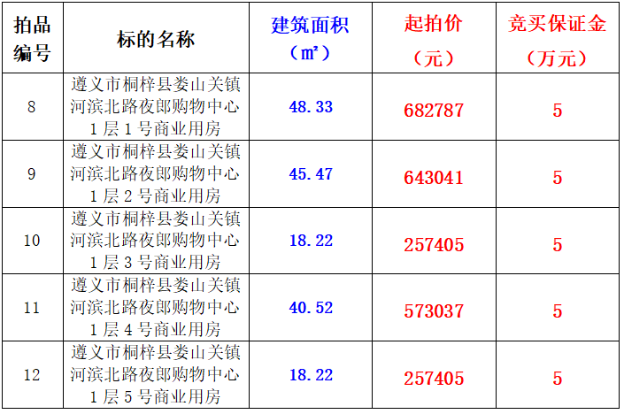 11、遵义市桐梓县娄山关镇河滨北路夜郎购物中心1层4号商业用房,建筑面积:40.52㎡,起拍价:573037元,竞买保证金:5万元;